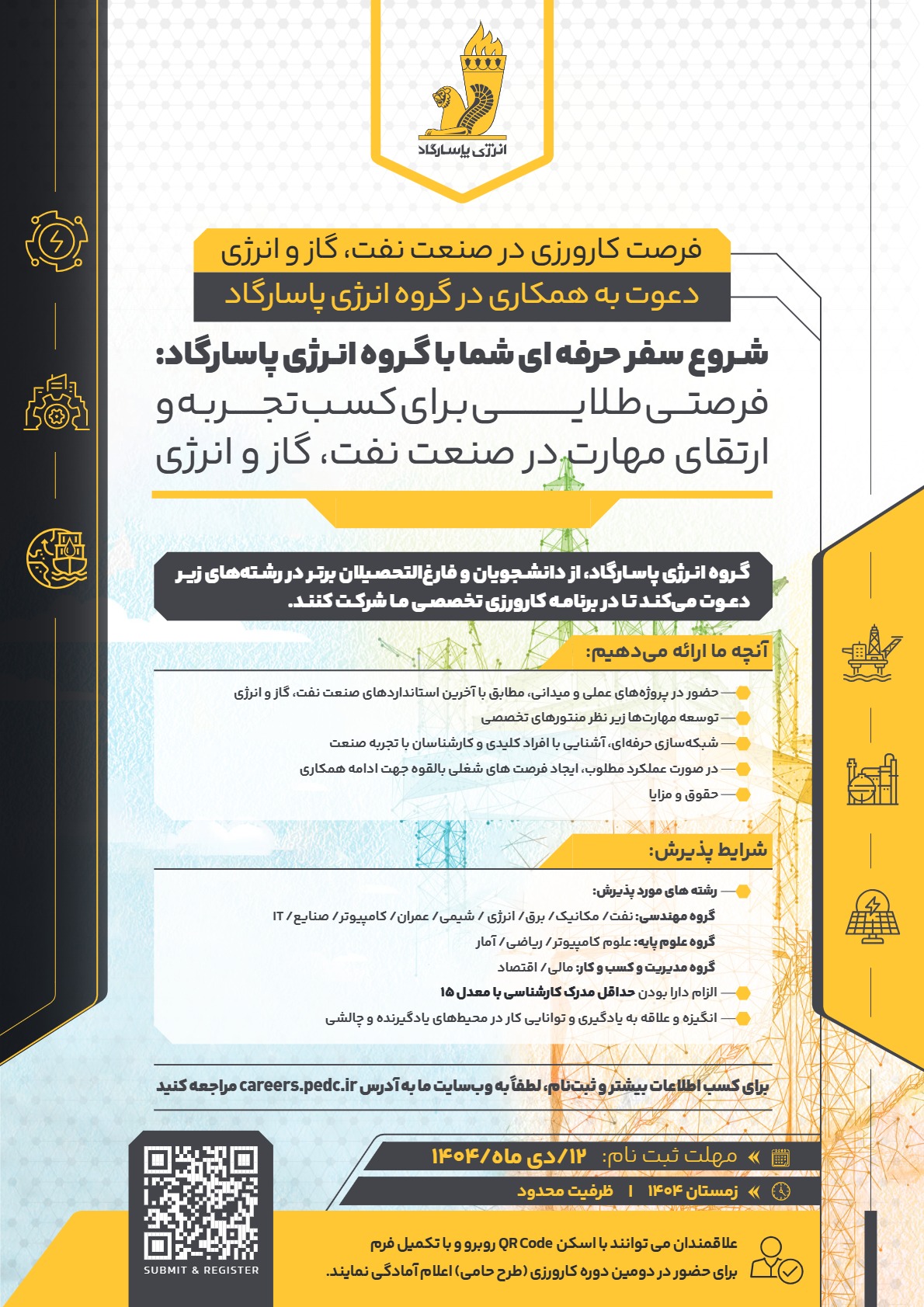 گروه انرژی پاسارگاد، از دانشجویان و فارغ‌التحصیلان برتر در رشته‌های زیر دعوت می‌کند تا در برنامه کارورزی تخصصی ما شرکت کنند. این فراخوان، فرصتی استثنایی برای ورود به دنیای واقعی صنعت نفت، گاز و انرژی فراهم می‌کند تا با همراهی متخصصان این حوزه، تجربه عملی کسب کرده و مهارت‌های خود را توسعه دهید. این فرصت کارورزی همراه با حقوق و مزایا است و در صورت عملکرد مطلوب در طول دوره کارورزی، فرصت های شغلی بالقوه­ای برای شرکت کنندگان جهت ادامه همکاری فراهم خواهد شد.